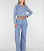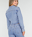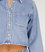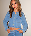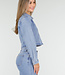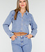Diese hellblaue Jeansbluse ist ein kurzes Modell mit langen Ärmeln. Das Design wird vorne mit Knöpfen geschlossen und hat einen klassischen Kragen. Auf der Brust befindet sich eine aufgesetzte Tasche, die mit kontrastierenden Nähten verziert ist. Die Bluse hat einen geraden Saum, der knapp über der Taille endet.