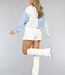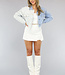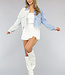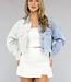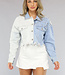 Diese Jeansjacke ist zu süß für ein Festival! Die Jacke hat einen hochgeschlagenen Kragen, der in einen Knopfverschluss aus vier Knöpfen übergeht. Die Jacke hat zwei Brusttaschen und ist mit silbernen Nieten besetzt. Außerdem hat die Jacke ein geripptes Detail an der Unterseite.