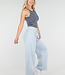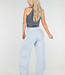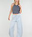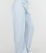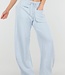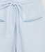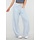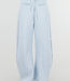 Diese Jogginghose ist in Hellblau gehalten und hat ein Barrel-Modell mit leicht abgerundeten, weiten Beinen. Der Bund ist mit einem elastischen Band mit Kordelzug versehen. Auf der Vorderseite befinden sich zwei Paspeltaschen. Die Rückseite ist mit einer schrägen Gesäßtasche versehen. Die Hose fällt locker um den Oberschenkel und läuft subtil zum Saum hin aus.