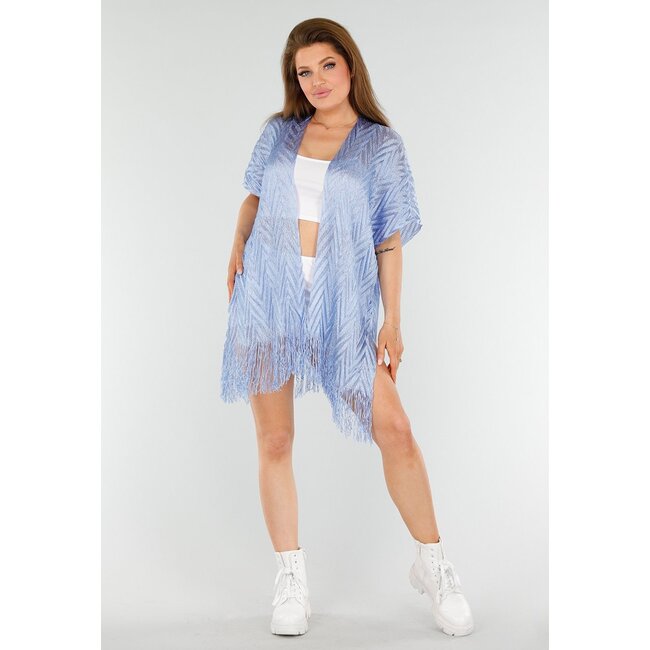 Dieser hellblaue Überwurf ist aus einem leichten Material mit sichtbarer Zickzack-Struktur gefertigt. Es ist vorne offen und ohne Verschluss, hat kurze Ärmel und eine gerade Passform. Entlang des Saums und der Ärmel sind dekorative Rüschen eingearbeitet. Die Länge reicht bis zur Mitte des Oberschenkels und ist an den Seiten tief geschlitzt. Das Material ist halbtransparent und luftig, ideal zum Tragen über Bademode oder auf einem Festival.