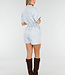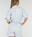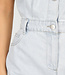 Dieser Playsuit ist aus hellblauem Denim gefertigt und besteht aus einem einteiligen Oberteil im Blusenstil und einer Shorts. Das Modell hat kurze Ärmel mit umgeschlagenen Enden und einen klassischen Kragen. Auf der Vorderseite ist der Playsuit mit einer durchgehenden Knopfleiste versehen. Die Taille ist leicht tailliert und hat einen festen Bund mit Gürtelschlaufen. Die Shorts haben ein gerades Bein und Eingrifftaschen auf der Vorderseite. Der Denimstoff hat eine feste Struktur mit leichtem Stretch.