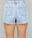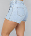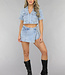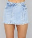 Dieser Skort hat eine hellblaue Denimfarbe und ist aus Baumwolle gefertigt. Der Skort hat ein süßes Klappendesign und wird mit einem Reißverschluss und Knopf geschlossen. Außerdem hat der Skort einen zusätzlichen Knopf auf der linken Seite, um die Klappe zu befestigen. Auf der Rückseite sieht man, dass der Skort eine Hose enthält und zwei Gesäßtaschen hat. Der Skort ist dehnbar und gehört zu einem Set.