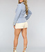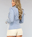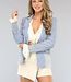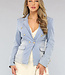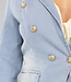 Dieser hübsche Denim-Blazer hat lange Ärmel und einen Kragen. Der Blazer besteht aus einem Stoff in Denim-Optik und hat Schulterpolster. Auf der Vorderseite hat er sechs Knöpfe, von denen einer als Verschluss dient. Außerdem hat er zwei Taschen auf der Vorderseite.