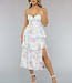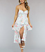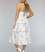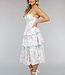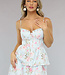 Dieses zu niedliche Kleid ist aus einem feinen, festen Stoff gefertigt. Das Kleid verfügt über einen niedlichen Blumendruck und hat ein Korsett Blick auf die Taille macht das Kleid schön ausgestattet. Das Oberteil des Kleides hat einen herzförmigen Ausschnitt und das Kleid hat verstellbare Spaghetti-Träger. Der Rock des Kleides ist mehrlagig und mit Rüschen versehen.