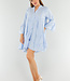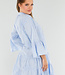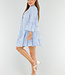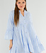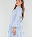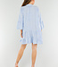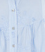 Dieses hellblaue Kleid ist aus 100% Baumwolle gefertigt und hat eine leichte, atmungsaktive Struktur. Das Modell hat eine kurze Länge mit einem ausgestellten Rock, der mit einem Volantsaum abschließt. Das Kleid wird vorne mit Knöpfen geschlossen und hat einen Stehkragen mit einer kleinen V-Kerbe. Die Ärmel sind dreiviertellang und gehen in eine weite Trompetenform über. Ton-in-Ton gestickte Blumenmotive sind über den Stoff verteilt. Das Kleid hat keinen Stretchanteil und fällt locker um den Körper.