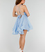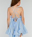 Dieses hellblaue Kleid ist aus einem gefütterten, nicht dehnbaren Scuba-Stoff gefertigt und hat einen tiefen V-Ausschnitt mit Spaghettiträgern, die sich über den Rücken kreuzen. Der Rücken ist komplett offen und wird mit verstellbaren Bändern in einer Schleife am unteren Ende des Rückens geschlossen. Die Rückseite des Kleides ist länger als die Vorderseite und hat eine A-Linie und eine verstärkte Rüsche am unteren Ende. Der Stoff ist leicht, geschmeidig und vollständig gefüttert. Das Kleid fällt oberhalb des Knies. Die Taille ist mit einem Gummizug versehen und hebt Ihre Figur schön hervor!