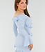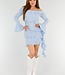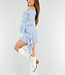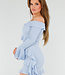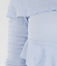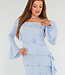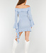 Dieses kurze Kleid ist in einem hellblauen Farbton gehalten, hat einen schulterfreien Ausschnitt und lange Ärmel. Das Kleid hat mehrere Rüschendetails und Volants, die asymmetrisch über den Körper verlaufen. Die Ärmel sind bis zum Ellenbogen eng anliegend und laufen dann weit aus. Die Passform ist eng und passt sich dem Körper an. Der leicht gerippte Stretch-Stoff verleiht dem Kleidungsstück eine leichte Textur.