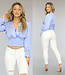 Keywords: Blaues Top im Satin-Look, gepflegtes hellblaues langärmeliges Top, Crop-Top, kurzes Top mit Überschlag, elastisches Haargummi, V-Ausschnitt, Überschlag, lange Ärmel, Satin