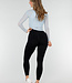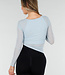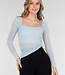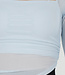 Dieses asymmetrische Oberteil ist aus hellblauem Mesh-Material mit einer feinen, transparenten Struktur gefertigt. Das Modell hat eine figurbetonte Passform, lange Ärmel und einen geraden, quadratischen Ausschnitt. Unter dem Mesh befindet sich eine glatte Innenlage mit integrierten Polstern, die für zusätzliche Abdeckung auf der Vorderseite sorgen. Das Top hat schmale Träger. Das Material ist leicht und dehnbar und passt sich dem Oberkörper an.