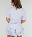 Dieses babyblaue Set besteht aus einem kurzärmeligen Shirt mit Kragen und einem passenden Skort. Der Stoff ist horizontal gestreift und mit zarten Rüschen und Spitzendetails versehen. Das Shirt hat einen V-Ausschnitt mit Stehkragen und eine gerade, leicht lockere Passform. Der passende Skort sieht aus wie ein Rock, hat aber innen eine kurze Hose. Die Taille ist mit einem Gummizug versehen.