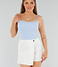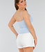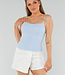 Dieses Basic-Top aus festem Stretch-Stoff hat einen quadratischen Ausschnitt mit dünnen Spaghetti-Trägern. Die herausnehmbaren festen Cups bieten Halt und Form ohne Bügel. Die dickere Qualität sorgt dafür, dass das Material nicht durchscheint und das Oberteil an seinem Platz bleibt. Das Modell hat eine eng anliegende Passform, die dem Körper folgt. Ideal, um es locker zu tragen oder unter einem schönen Blazer zu kombinieren.