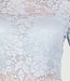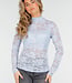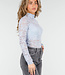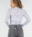 Dieses Oberteil ist aus einem feinen Spitzenmaterial mit einer offenen Blumenstruktur gefertigt. Das Modell hat eine figurbetonte Passform, lange Ärmel und einen hohen Rundhalsausschnitt. Im Brustbereich wurde auf der Innenseite ein zusätzlicher glatter Mesh-Einsatz angebracht, wodurch dieser Teil weniger durchscheinend ist. Der Rest des Oberteils ist transparent.