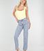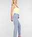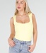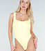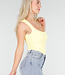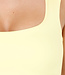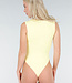 Dieser Body ist in Gelb gehalten und hat eine figurbetonte Passform. Das Modell ist ärmellos und hat einen quadratischen Ausschnitt vorne. Der Body ist an den Hüften hoch geschnitten. Der untere Teil wird mit einem Hakenverschluss geschlossen. Der Stoff ist glatt und elastisch.