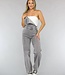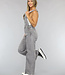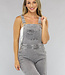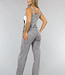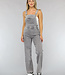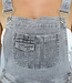 Dieser Anzug ist aus einem robusten Denim-Stoff gefertigt. Er ist allgemein geschnitten, das heißt, der Anzug hat über die Schulter verlaufende Schulterriemen. Auf der Vorderseite hat er eine große Tasche auf dem Bauch, in die eine einzelne kleine Tasche eingearbeitet ist. Sowohl die linke als auch die rechte Seite haben einen Knopfverschluss mit drei Knöpfen unter einander. Diese dienen dazu, die Hose leichter anziehen zu können. Die Hosenbeine sind gerade geschnitten und die Hose hat zwei Vordertaschen und zwei Gesäßtaschen.