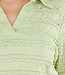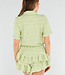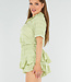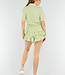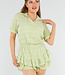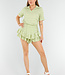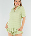 Dieses grüne Set besteht aus einem kurzärmeligen Hemd mit Kragen und einem passenden Skort. Der Stoff ist horizontal gestreift und mit zarten Rüschen und Spitzendetails versehen. Das Shirt hat einen V-Ausschnitt mit Stehkragen und eine gerade, leicht lockere Passform. Der passende Skort sieht aus wie ein Rock, hat aber innen eine kurze Hose. Die Taille ist mit einem Gummizug versehen.