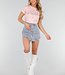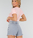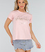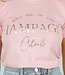 Dieses hellrosa T-Shirt ist aus weichem, dehnbarem Baumwolljersey gefertigt und hat einen Rundhalsausschnitt mit kurzen, gekrempelten Ärmeln. Auf der Brust befindet sich ein goldfarbener Metallic-Print mit der Aufschrift "Champagne Club". Das Oberteil hat eine gerade Passform und fällt an den Hüften. Die Rückseite ist einfarbig und unbedruckt.