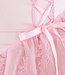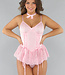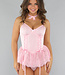 Dieses Set hat eine süße blassrosa Farbe. Es hat ein Kleid mit Körbchen, die Bügel haben. Unter dem Bügel ist der Bauch eingefädelt und endet in einer süßen Schleife. Das Kleid hat einen ausgestellten Rock mit verstellbaren Strapsen. Es kann mit einem Hakenverschluss am Rücken geschlossen werden, der aus zwei Haken besteht, die in drei Positionen eingestellt werden können. Unter dem Kleid trägt man den passenden Tanga und befestigt die mitgelieferten Strümpfe an den Strapsen. Um den Look zu vervollständigen, fügen Sie das Halsband mit Fliege hinzu!