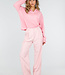 Diese hellrosa Hose ist aus einem glatten Stoff gefertigt und hat eine gerade, weite Passform. Das Modell hat eine hohe Taille mit Gürtelschlaufen und einen Knopf- und Reißverschluss vorne. Auf der Vorderseite sind dezente Falten eingearbeitet, die für zusätzliche Weite an den Hüften sorgen. Die Hosenbeine fallen gerade und weit bis zum Fuß.