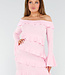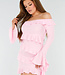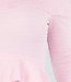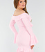 Dieses kurze Kleid ist in einem hellen Rosaton gehalten, hat einen schulterfreien Ausschnitt und lange Ärmel. Das Kleid hat mehrere Rüschendetails und Volants, die asymmetrisch über den Körper verlaufen. Die Ärmel sind bis zum Ellenbogen eng anliegend und laufen dann weit aus. Die Passform ist eng und passt sich dem Körper an. Der leicht gerippte Stretch-Stoff verleiht dem Kleidungsstück eine leichte Textur.