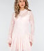 Dieses elegante Kleid ist aus einem feinen Spitzenstoff mit einem dezenten Blumenmuster gefertigt. Das Modell hat eine leicht ausgestellte Passform mit einem mehrlagigen Rock für einen verspielten Effekt. Der Ausschnitt ist mit einem Stehkragen und dekorativen Knöpfen auf der Vorderseite verziert. Die langen Ärmel sind transparent und laufen in einer leicht ausgestellten Manschette aus. Das Kleid ist für zusätzlichen Tragekomfort am Körper gefüttert. Auf der Rückseite ist das Kleid mit einem verdeckten Reißverschluss versehen, sodass es sich leicht an- und ausziehen lässt.