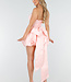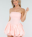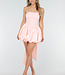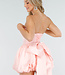 Dieses hellrosa trägerlose Kleid ist aus glänzendem Satin mit Stretch-Anteil gefertigt, wodurch es sich angenehm an den Körper anschmiegt. Das Oberteil verläuft in einer V-Form. Der Rock ist rund und ballonförmig geformt und hat einen Gummizug am Saum. Der Rücken ist mit einer Schnürung versehen, die eine verstellbare Passform ermöglicht. Die breite Schleife mit langen Bändern ist mit Druckknöpfen befestigt und kann komplett abgenommen werden, so dass das Kleid auch ohne Schleife getragen werden kann.