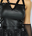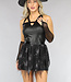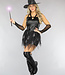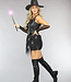 Wie genial ist dieses Kostüm! Das Kleid des Kostüms ist aus einem Stretch-Stoff in Lederoptik gefertigt. Das Oberteil des Kleides ist mit schwarzen Pailletten besetzt und läuft in Neckholderform zum Hals. Der Rock, der lose mit dabei ist, besteht aus einem Tüllstoff mit kleinen Glitzer, Sternen und Monden. Dieser Rock kann mit Hilfe des Bandes an der Taille gebunden werden. Zu diesem Kostüm gehören außerdem Netzhandschuhe mit Löchern für die Finger. Was natürlich nicht fehlen darf, ist der Hexenhut!