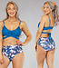 Dieser hübsche Bikini besteht aus einem Unterteil mit Blattdruck und einem einfarbigen meergrünen Oberteil. Das Unterteil hat eine hohe Taille und ist mit einem Blattdruck versehen. Es fällt sauber über das Gesäß und ist in Falten gelegt. Das Oberteil hat abnehmbare Polster und verstellbare Schultergurte. Dieses Oberteil hat zwei lange Träger unter der Brust, die Sie auf verschiedene Weise um Ihre Taille wickeln/knüpfen können. Der Bikini hat einen tropischen Aufdruck.