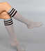 Diese Socken reichen bis unter das Knie und sind aus einem dehnbaren Stoff gefertigt. Sie sind grau und haben drei schwarze Streifen am oberen Ende.