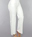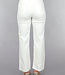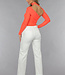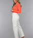 Diese Jeans sind aus einem Baumwoll-Denim-Stoff hergestellt. Das Modell der Jeans hat ein gerades Bein und eine hohe Taille. Sie wird vorne mit einem Reißverschluss und einem einzigen Knopf geschlossen. Die Jeans hat zwei Eingrifftaschen vorne und zwei Gesäßtaschen. Um die Taille herum befinden sich fünf Schlaufen, durch die man einen Gürtel tragen kann. Die Jeans hat einen Stretch-Anteil und ist daher sehr bequem zu tragen. Am unteren Ende ist die Jeans ausgefranst.