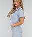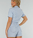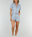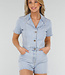 Dieser hellblaue Playsuit ist aus einem Jeansstoff mit Stretch und hat eine figurbetonte Passform. Er hat kurze Ärmel und einen Reverskragen mit drei Knöpfen auf der Vorderseite. Der Playsuit hat eine hohe Taille und kurze Beine mit einem abgerundeten Saum. Sowohl auf der Vorder- als auch auf der Rückseite befinden sich aufgesetzte Taschen. Der Playsuit lässt sich mit einem Knopfverschluss schließen und hat sichtbare Nähte aus kontrastierenden Fäden, die dem Körper folgen und Ihre Figur betonen.