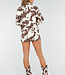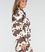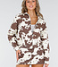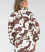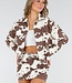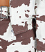 Diese Jacke ist aus robustem weiß-braunem Denim mit einem Allover-Kuh-Print. Sie wird mit einem silberfarbenen Reißverschluss geschlossen und hat einen klassischen Kragen. Die Passform ist gerade mit einem leicht elastischen Saum auf der Rückseite. Die Ärmel sind lang und es gibt Seitentaschen.