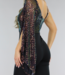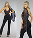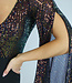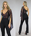 Dieser Jumpsuit ist oben mit schönen Glitzerpailletten besetzt und hat ein Netzmaterial. Auf der einen Seite hat der Jumpsuit einen offenen langen Ärmel und ist asymmetrisch. Auf der anderen Seite hat der Jumpsuit einen Spaghetti-Träger. Der untere Teil des Jumpsuits hat eine ausgestellte Passform. Sie können den Jumpsuit mit einem Reißverschluss anziehen.