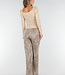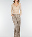 Diese Hose ist in einer kamelfarbenen Grundfarbe mit einem Allover-Print in Offwhite gehalten. Das Modell ist aus einem weichen Stretchstoff gefertigt und hat einen bequemen Bund. Die Hose hat ein gerades Bein und fällt geschmeidig entlang des Beins. Der Stoff ist leicht und flexibel.