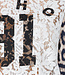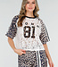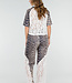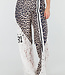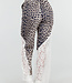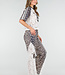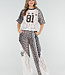 Dieses Set besteht aus einem Oberteil und einer passenden langen Hose mit einer Kombination aus Spitze und Leopardenmuster. Das Oberteil ist aus transparenter weißer Spitze mit kurzen Ärmeln, Rundhalsausschnitt und kontrastierenden Bündchen gefertigt. Auf der Vorderseite ist ein grafischer Textdruck zu sehen. Die Hose hat gerade, lange Beine und ist teilweise aus transparenter Spitze und teilweise aus Stoff mit Leopardenmuster gefertigt. An den Seiten verlaufen kontrastierende vertikale Streifen. Die Hose hat einen elastischen Bund mit Kordelzug und Seitentaschen.