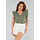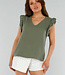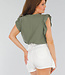 Dieses khakifarbene Oberteil ist aus einem luftigen Stoff mit Stretchanteil und einer Textur in Leinenoptik gefertigt. Es hat einen V-Ausschnitt und kurze Ärmel, die mit verspielten Rüschen abschließen. Der Stoff hat eine leicht gekräuselte, hydrophile Textur. Die Passform ist gerade und locker, das Oberteil fällt bis knapp über die Hüfte. Der Rücken ist einfarbig.