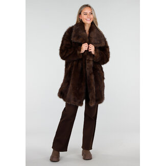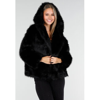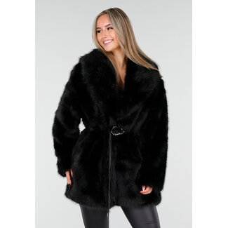 Schwarzer flauschiger Wintermantel mit Gürtel