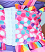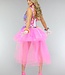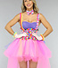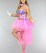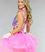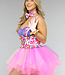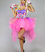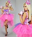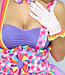 Dieses farbenfrohe Kostüm zieht alle Blicke auf sich! Das Oberteil des Kleides hat eine vertikale gesmokte Linie an der Büste. Der Rock ist mit einem Petticoat überzogen, der rundherum aus sechs Lagen besteht. Am Rücken befinden sich vier weitere Lagen, die durch ihre Länge einen Vokuhila bilden. Rund um den Rock sind kleine farbige Streifen angebracht, die einen verspielten Effekt erzeugen. Das Unterbrustkorsett ist mit einem Polka-Dot-Muster versehen. Die Rüschen, die die Ränder und die Blume auf der Vorderseite bilden, sind mit einem farbigen Streifenmuster versehen. Auf der Rückseite befindet sich ein dreifacher Klettverschluss. Die Schulterträger können durch drei Knopflöcher auf die gewünschte Größe eingestellt werden. Die Halskrawatte hat eine Schleife und kann mit Klettverschluss geschlossen werden. Die Handschuhe haben einen gerüschten Rand und sind ebenfalls mit einem Streifenmuster versehen. Der Minihut hat ein Tupfenmuster und kann mit zwei Stecknadeln im Haar befestigt werden.