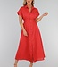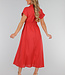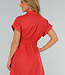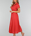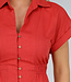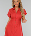 Dieses korallenrote Hemdblusenkleid hat eine Midi-Länge und eine gerade Silhouette, die durch einen elastischen Einsatz an der hinteren Taille angepasst wird. Das Kleid hat einen klassischen Hemdkragen, kurze Ärmel mit festen Umschlägen und einen durchgehenden Knopfverschluss mit kleinen runden Knöpfen. Es fällt bis zur Mitte der Wade und hat einen leicht ausgestellten Rock. Der Stoff ist einfarbig und strukturiert, ohne Stickerei.
