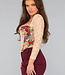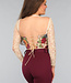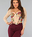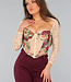 Dieses Oberteil ist aus einem Spitzenstoff mit Blumendruck gefertigt. Es hat eine Korsett-Optik und die Cups sind mit Bügeln vorgeformt. Die Rückseite des Tops hat ein Spitzendetail, das Sie nach Belieben binden können. Das Oberteil hat halblange Spitzenärmel und ein Band im Nacken, das die Ärmel an Ort und Stelle hält. Außerdem hat dieses Oberteil verstärkte Stäbchen, wodurch es gut sitzt.