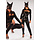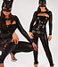 Dieses Kostüm besteht aus mehreren Einzelteilen und ist aus schwarzem Stoff mit Lederoptik und Stretch gefertigt. Das Kostüm umfasst ein Korsett-Oberteil, eine Hose, lose Ärmel, eine Maske und einen passenden Gürtel. Die Hose hat eine niedrige Taille, lange Beine und einen Reißverschluss an der Seite. Der Stoff der Hose ist elastisch. Das Korsett-Oberteil wird mit einem Reißverschluss an der Seite geschlossen und hat einen Schnürverschluss auf der Rückseite. Die losen Ärmel sind aus dem gleichen Stoff wie die Hose, sind dehnbar und werden sowohl vorne als auch hinten mit einem Schnürverschluss geschlossen. Die Maske und der Gürtel vervollständigen das Kostüm. Das gesamte Kostüm hat eine figurbetonte Passform.