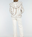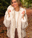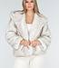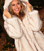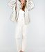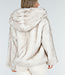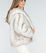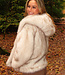 Diese Jacke ist aus beigem Kunstfell gefertigt und hat eine weiche, voluminöse Struktur. Das Modell verfügt über eine Kapuze und lange Ärmel. Die Jacke wird vorne mit mehreren Hakenverschlüssen geschlossen, die dezent in den Stoff eingearbeitet sind. Die Länge reicht bis knapp über die Hüfte und der untere Saum ist gerade geschnitten.