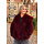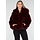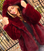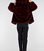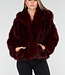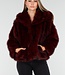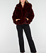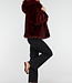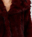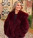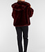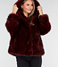 Diese Jacke ist aus burgunderrotem Kunstfell gefertigt und hat eine weiche, voluminöse Struktur. Das Modell verfügt über eine Kapuze und lange Ärmel. Die Jacke wird vorne mit mehreren Hakenverschlüssen geschlossen, die dezent in den Stoff eingearbeitet sind. Die Länge reicht bis knapp über die Hüfte und der untere Saum ist gerade geschnitten.