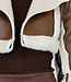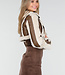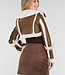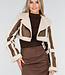 Diese kurze braune Jacke ist aus einem Lederimitatstoff mit weichem Kunstfell gefertigt. Die Jacke hat breite Revers, gerade Ärmel und sichtbare Kanten in derselben Fellstruktur entlang der Seiten und Ärmel. Das Modell ist tailliert geschnitten.