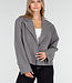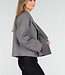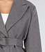 Diese kurze Jacke ist aus einem grauen Stoff in Wolloptik mit einem dezenten Fischgrätenmuster gefertigt. Das Modell hat einen klassischen Reverskragen und eine doppelte Knopfleiste auf der Vorderseite. Der Gürtel aus dem gleichen Stoff kann gebunden werden, um die Taille zu betonen. Die Ärmel sind mit Knopfdetails an den Manschetten versehen.