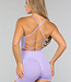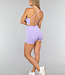 Rundhalsausschnitt mit Spaghetti-Trägern und herausnehmbaren Einlagen. Der Rücken ist offen und hat Riemen quer über den Rücken. Die Shorts des Sets haben eine hohe Taille und einen Bügel auf dem Rücken.