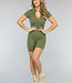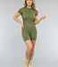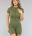 Dieser Body ist aus einem festen, dicken Stretch-Stoff gefertigt. Der Strampelanzug hat einen Reißverschluss an der Vorderseite, der bis zum Hals geschlossen werden kann. Die Ärmel und Beine sind beide kurz.