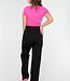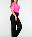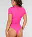 Dieser leuchtend rosafarbene Body kombiniert ein schmeichelhaftes Design mit trendigem Appeal. Der tiefe V-Ausschnitt und die drapierte Drehung auf der Vorderseite sorgen für eine elegante Silhouette. Die kurzen Ärmel bieten zusätzlichen Komfort, während sich der dehnbare Stoff perfekt an den Körper anpasst. Der hohe Ausschnitt am unteren Ende setzt einen raffinierten und modernen Akzent. Ideal zum Kombinieren mit hoch taillierten Hosen oder Röcken für einen stilvollen Look. Der Body hat einen Hakenverschluss, der sich in drei Positionen einstellen lässt.