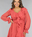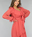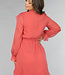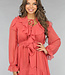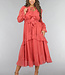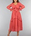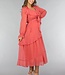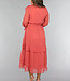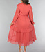 Dieses lange Kleid ist aus einem luftigen Chiffonstoff gefertigt. Das Oberteil des Kleides hat einen V-Ausschnitt, der mit niedlichen Rüschen und einem Schleifendetail versehen ist. Das Kleid hat einen ausgestellten Rock mit einem Lagenmuster. Das Kleid hat Trompetenärmel und ist durchsichtig. Es ist mit einem Innenkleid ausgestattet, damit es nicht durchscheint. Das Innenkleid und das Chiffonkleid haben keinen Stretchanteil, fallen aber fließend. Um die Taille herum ist es dehnbar und hat einen passenden Bund.