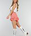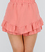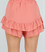 Diese lachsfarbenen Shorts sind aus einem luftigen, leicht geknitterten Baumwollstoff mit Leinenoptik gefertigt. Die Shorts haben einen elastischen Bund und eine lockere, weite Passform. Am unteren Ende sind die Shorts mit zwei Lagen Rüschen versehen, die vorne, an der Seite und hinten herunterlaufen und die Shorts wie einen Rock aussehen lassen.
