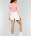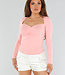 Dieses lachsrosa Oberteil hat eine taillierte Passform und lange Ärmel. Der Ausschnitt hat eine herzförmige Form und ist vorne leicht überschnitten. Der Stoff ist glatt, dehnbar und glänzend. Das Oberteil ist einfarbig ohne Muster oder Aufdrucke und hat einen geraden Saum, der auf der Hüfte endet. Der Rücken hat einen Rundhalsausschnitt.